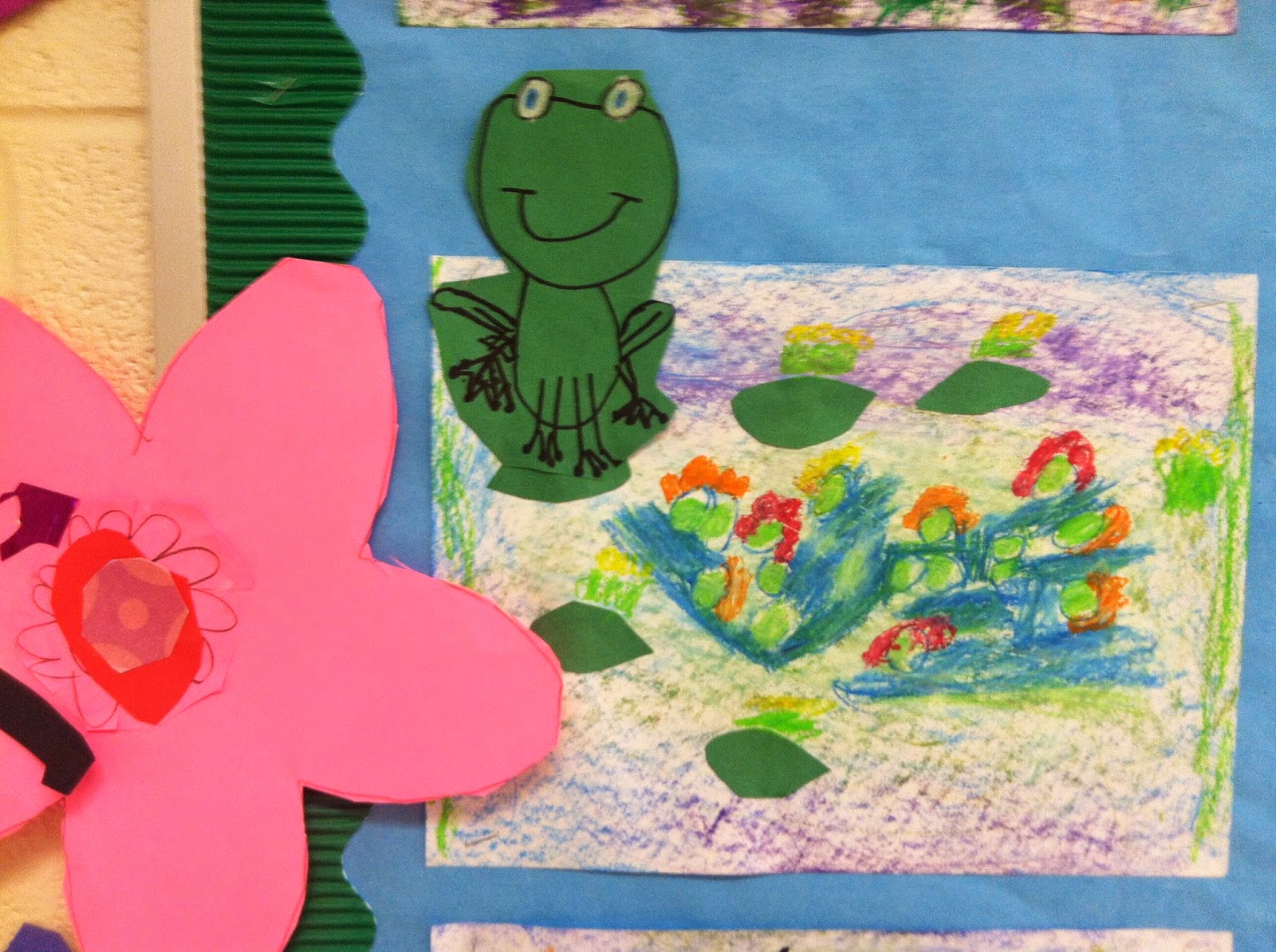 Finally, spring is here after a long winter and very chilly temps here in the Carolinas. I painted a backdrop for my 1st graders who are learning about the artist Claude Monet. They used cool colors for the water and drew water lilies with pastels. As a final touch, they added a pond animal such as a frog, alligator or dragonfly. These were so fun to make! At the same time, my kindergarteners were practicing their "cut and turn" skills as I call them with scissors and made curvy cut outs like the artist Henri Matisse. The bold colors on the flowers really pop in the hallway! Love it!